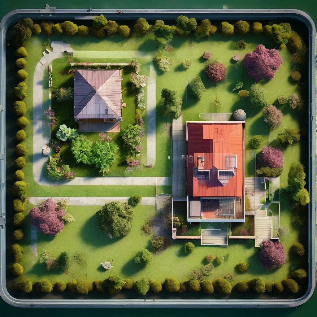 Запрос: «Планировка участка в 5,7 соток, вид сверху летом с одноэтажным домом и домом для гостей»